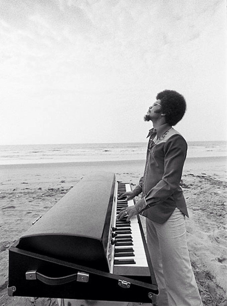 Foto: Herbie Hancock på stranden med sit Fender Rhodes el-piano.